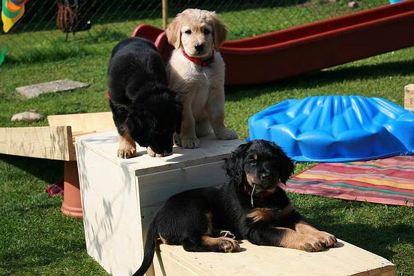 Sobald die Welpen alt genug sind, geht es nach draußen, dort gibt es einen ausgiebigen Welpenspielplatz zu erkunden, u. a. mit Tunnel, Zelt, Bällebad, Wippe und vielem anderem mehr. Kurz vor der Abgabe dürfen die Kleinen bereits kleine Spaziergänge mit uns auf der nahe gelegenen Wiese machen, mehrmals Auto fahren und natürlich werden sie auch mit den Grundzügen der Stubenreinheit vertraut gemacht.